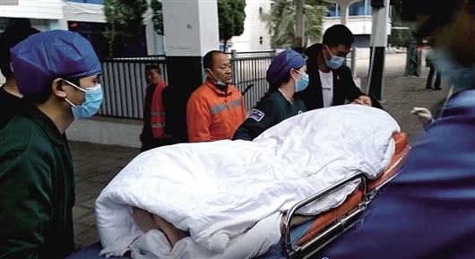 在江西信豐站臨時(shí)???jī)煞昼?,大家協(xié)力將產(chǎn)婦和新生兒抬到120急救車(chē)上,送往醫(yī)院進(jìn)一步治療。(圖片由劉晶新提供)