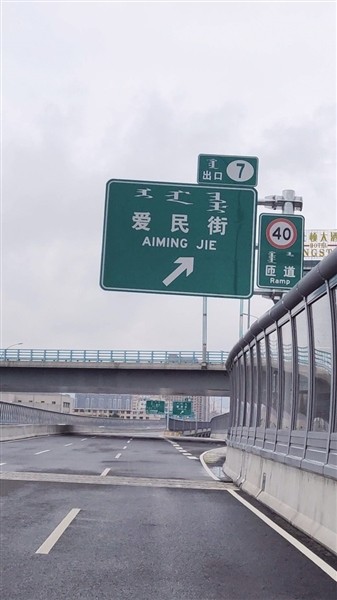 當(dāng)日,記者駕車來(lái)到哲里木路高架橋,沿南向北方向行駛,看到沿路提示愛(ài)民街下行匝道口的路牌一共有4塊,每塊上都有中文和拼音,顯示為“愛(ài)民街”“AIMING JIE”。記者從愛(ài)民街下行匝道口到達(dá)愛(ài)民街與哲里木路輔路交會(huì)處,在東西方向的愛(ài)民街路口發(fā)現(xiàn)路牌名是由中文、蒙古文和拼音組成,其中拼音為“AIMIN JIE”。因呼市地區(qū)方言中,“MING”與“MIN”的發(fā)音不易分辨,這也是為什么網(wǎng)友在視頻中說(shuō)用方言命名路名的原因。