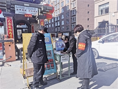 記者跟隨工作人員來到轄區(qū)地新街坊小區(qū),幾名社區(qū)工作人員正在小區(qū)門口負(fù)責(zé)疫情防控,“您好!請問您去哪棟樓?請下車登記信息。謝謝!”“請居民佩戴好口罩”……針對出入小區(qū)的人員,社區(qū)工作人員都一一仔細(xì)核查,宣傳防疫信息。“春節(jié)長假過后,很多事都堆到今天了,所以格外忙?!卑⒗票甭飞鐓^(qū)黨總支書記王海瓊說,阿拉善北路社區(qū)很多網(wǎng)格員都放棄了與家人團(tuán)聚的時(shí)間,主動(dòng)下沉到各個(gè)小區(qū)開展疫情防控工作,實(shí)行24小時(shí)輪崗制,做好外地返呼人員登記和掃碼工作,保證轄區(qū)防控安全。除此之外,還積極參與禁燃煙花爆竹、垃圾分類宣傳等工作,讓政策落到實(shí)處。