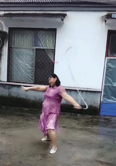 “清水河”大媽與抖音的相遇是在3年前。當(dāng)時(shí),遭遇了親人離世的她悲傷難抑,為了讓她分散注意力,她的女兒幫她下載了抖音。此后,大媽時(shí)常刷刷抖音,也慢慢從中悟出了一個(gè)道理,就是生活中不如意十之八九,人要好好活著,要快樂地活著。很快,大媽就從悲傷中走了出來,也學(xué)著在抖音上拍攝自己的日常。雖然起初視頻點(diǎn)贊量不多,但能記錄下生活的點(diǎn)滴足以讓她格外開心。一直到了去年9月份,大媽無意之中發(fā)布了一條雨中甩鞭子的視頻。視頻中,大媽身著一襲紅裙,有節(jié)奏地甩起了十幾斤重的鐵制麒麟鞭?!芭距?、啪嗒、啪嗒……”聲聲響亮、威風(fēng)凜凜。就是這條視頻讓她一夜爆紅。此后短短幾天,這條視頻的點(diǎn)贊量就突破了200萬,一時(shí)間,抖音上還掀起了一陣和大媽合拍的熱潮。