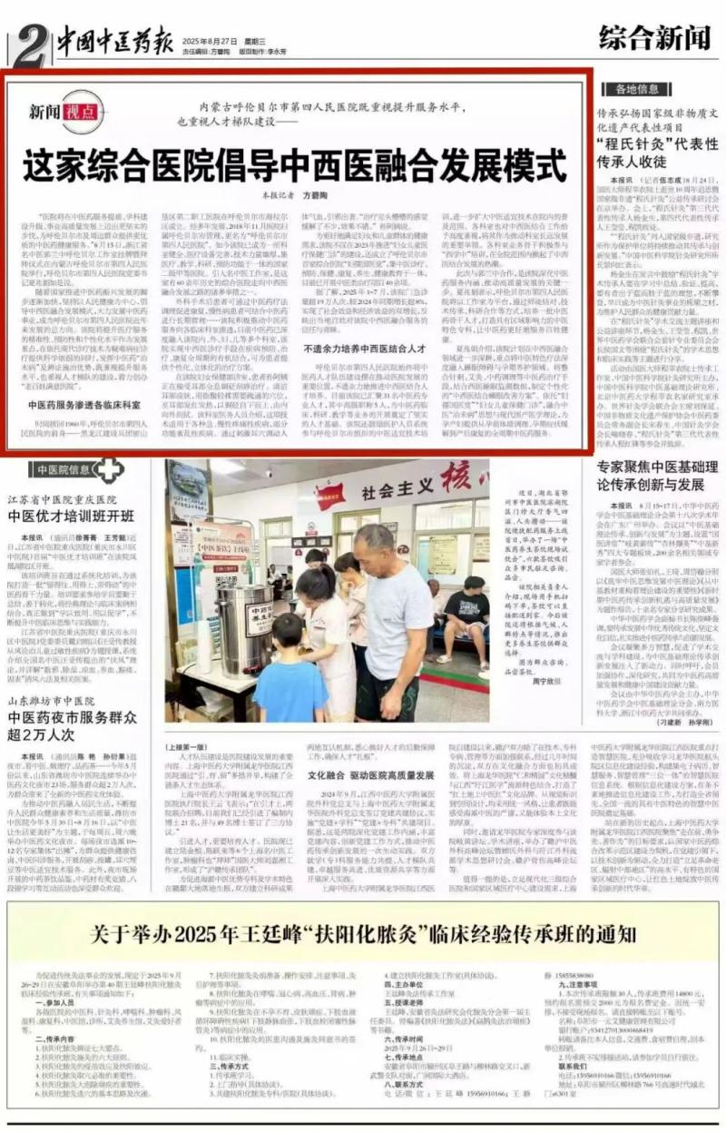 近日,呼倫貝爾市第四人民醫(yī)院傳來喜訊,其探索實踐的中西醫(yī)融合發(fā)展模式,登上國家級權威媒體《中國中醫(yī)藥報》2025年8月27日第二版重要版面。這不僅是對醫(yī)院發(fā)展成果的高度肯定,更為地區(qū)醫(yī)療事業(yè)高質量發(fā)展注入強勁動力。