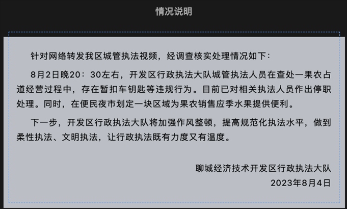 ·山東聊城通報“城管拔走小販車鑰匙”:相關(guān)執(zhí)法人員停職。