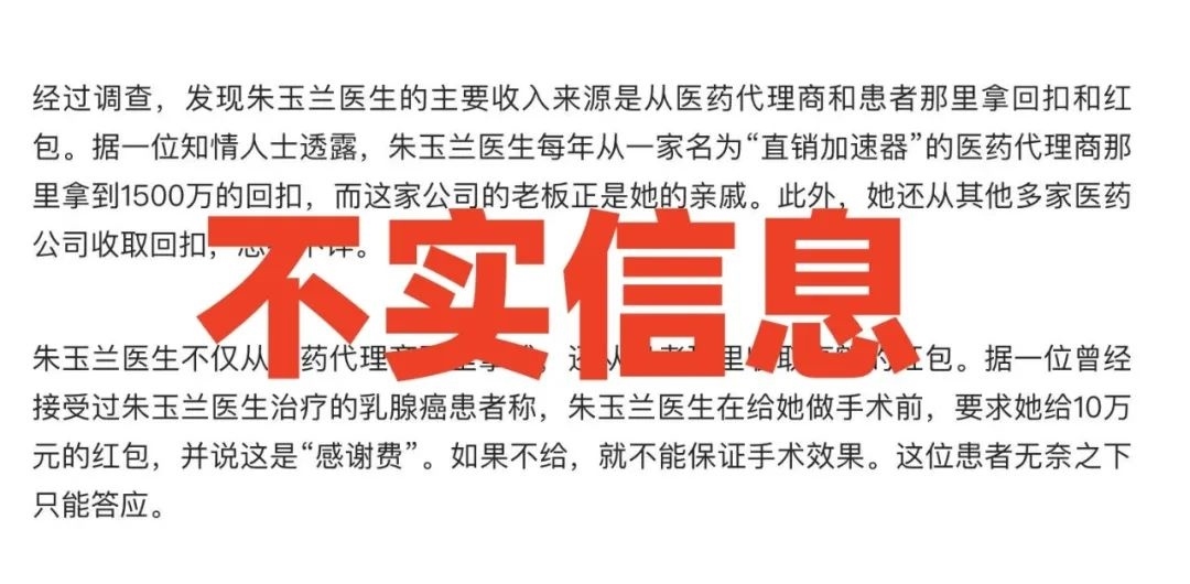 值得一提的是,該文將“抄家1.5億、20套房子”和“朱某某醫(yī)生的主要收入來源是從醫(yī)藥代理商和患者那里拿回扣和紅包”等信息列為“不實(shí)信息”,但未否認(rèn)“朱某某被抓”。