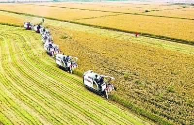 山東省德州市慶云縣鹽堿地上種植的千畝水稻收割現(xiàn)場(chǎng)。郭慶萍攝/光明圖片