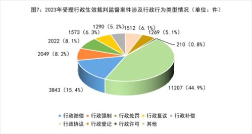 4.案涉行政行為類型中,行政賠償、行政強制、行政處罰等類案件占比較高,行政許可類案件處于低位。行政檢察監(jiān)督案件涉及的行政行為類型較為廣泛,從2023年行政生效裁判監(jiān)督案件情況看,涉及行政賠償類案件3843件、行政強制類案件2049件、行政處罰類案件2022件、行政復(fù)議類案件1573件、行政補償類案件1290件、行政協(xié)議類案件1512件、行政登記類案件1269件,這七類案件約占54.3%。特別指出的是,由于“放管服”改革的深入推進,近年來涉行政許可類行政生效裁判監(jiān)督案件始終處于低位,2023年辦理此類案件210件,占比僅為0.8%。