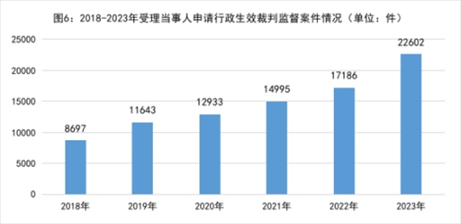 5.行政爭議實質(zhì)性化解持續(xù)深化做實。針對司法實踐中一些行政案件程序已結(jié)但訟爭未解的“程序空轉(zhuǎn)”“案結(jié)事不了”等問題,2023年共促進案涉行政爭議實質(zhì)性化解22310件,同比上升26%。其中,行政生效裁判監(jiān)督案件8524件,占38.2%;行政審判活動監(jiān)督案件2269件,占10.2%;行政執(zhí)行活動(含非訴執(zhí)行)監(jiān)督案件11517件,占51.6%。