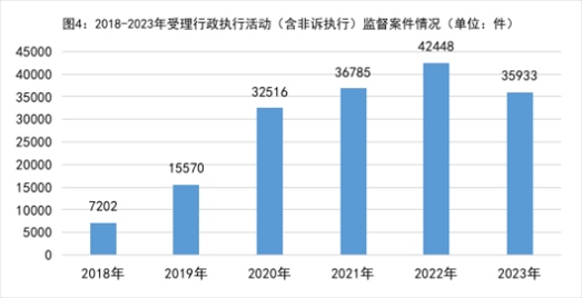 4.行政執(zhí)行活動監(jiān)督發(fā)展迅速,行政非訴執(zhí)行監(jiān)督占主導(dǎo)。2018年以來受理行政執(zhí)行活動(含非訴執(zhí)行)監(jiān)督案件分別是:2018年7202件、2019年15570件、2020年32516件、2021年36785件、2022年42448件,年均增加55.8%。2023年受理35933件,同比下降15.3%。其中,行政非訴執(zhí)行活動監(jiān)督34938件,占97.2%;行政訴訟執(zhí)行活動監(jiān)督995件,占2.8%。針對超期執(zhí)行、執(zhí)行裁定或決定違反法定程序、違法裁定終結(jié)本次執(zhí)行、怠于申請強制執(zhí)行等問題,向法院、行政機關(guān)提出檢察建議31790件,同比下降12.8%。