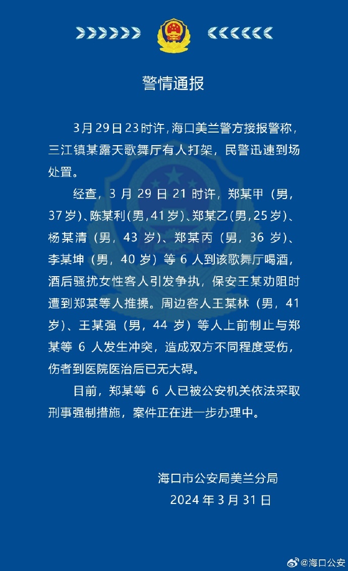 警方通報(bào)“??谝坏匾蛳特i手引發(fā)斗毆事件”:6人被采取刑事強(qiáng)制措施