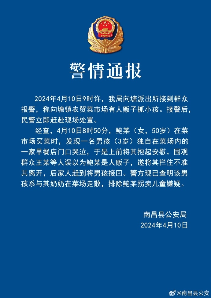 央視網(wǎng)消息:據(jù)@南昌縣公安微博消息,4月10日9時(shí)許,南昌縣公安局向塘派出所接到群眾報(bào)警,稱向塘鎮(zhèn)農(nóng)貿(mào)菜市場(chǎng)有人販子抓小孩。接警后民警立即趕赴現(xiàn)場(chǎng)處置。經(jīng)查,4月10日8時(shí)50分,鮑某(女,50歲)在菜市場(chǎng)買(mǎi)菜時(shí),發(fā)現(xiàn)一名男孩(3歲)獨(dú)自在菜場(chǎng)內(nèi)的一家早餐店門(mén)口哭泣,于是上前將其抱起安慰。圍觀群眾王某等人誤以為鮑某是人販子,遂將其攔住不準(zhǔn)其離開(kāi),后家人趕到將男孩接回。警方現(xiàn)已查明該男孩系與其奶奶在菜場(chǎng)走散,排除鮑某拐賣(mài)兒童嫌疑。