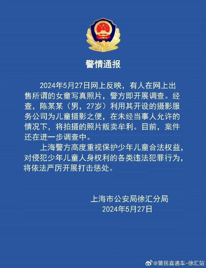 央視網(wǎng)消息:5月27日23時55分,上海市公安局徐匯分局發(fā)布警情通報:2024年5月27日網(wǎng)上反映,有人在網(wǎng)上出售所謂的女童寫真照片,警方即開展調(diào)查。經(jīng)查,陳某某(男,27歲)利用其開設(shè)的攝影服務(wù)公司為兒童攝影之便,在未經(jīng)當(dāng)事人允許的情況下,將拍攝的照片販賣牟利。目前,案件還在進(jìn)一步調(diào)查中。