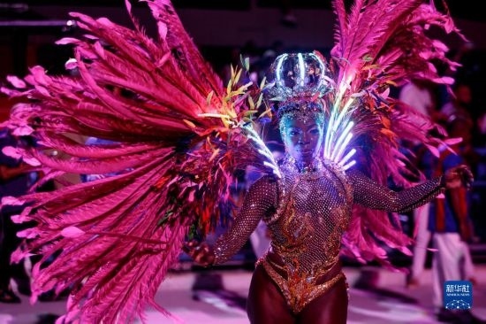 2月17日晚,在巴西里約熱內(nèi)盧桑巴大道,一名桑巴舞校演員參加狂歡節(jié)游行。