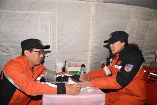 2月13日,在位于土耳其哈塔伊省哈塔伊體育館外的中國救援隊(duì)營地,醫(yī)生為救援隊(duì)成員檢查身體。