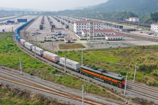 2023年4月3日,陸海新通道跨境鐵公聯(lián)運班列(重慶—瑞麗—緬甸)首發(fā)班列在重慶江津小南埡鐵路物流中心發(fā)車(無人機照片)。新華社記者 唐奕 攝