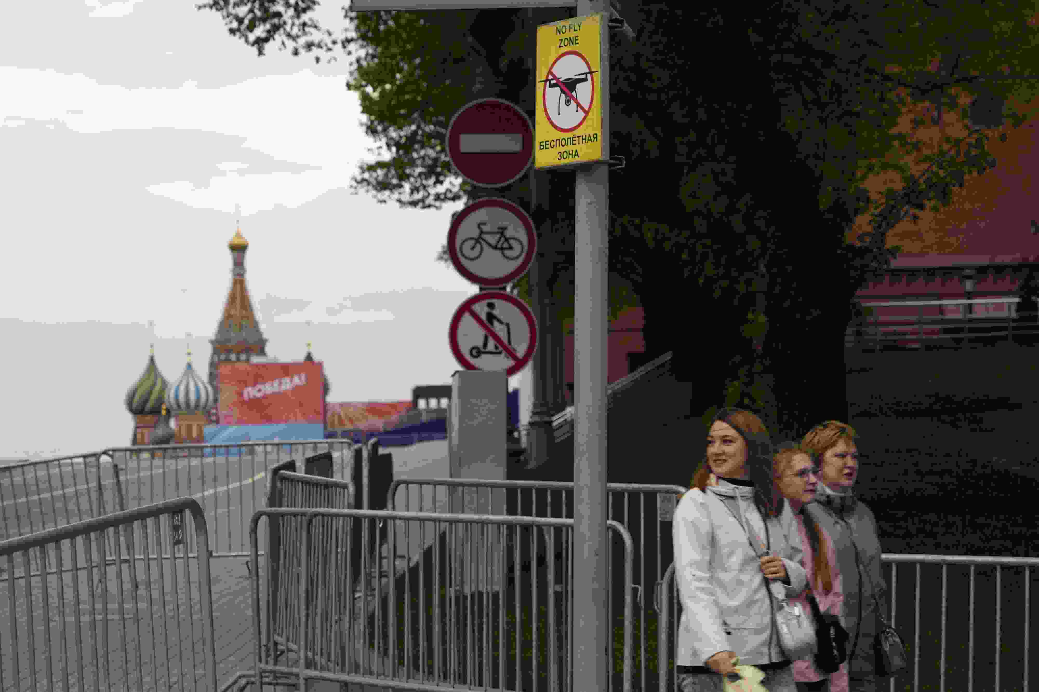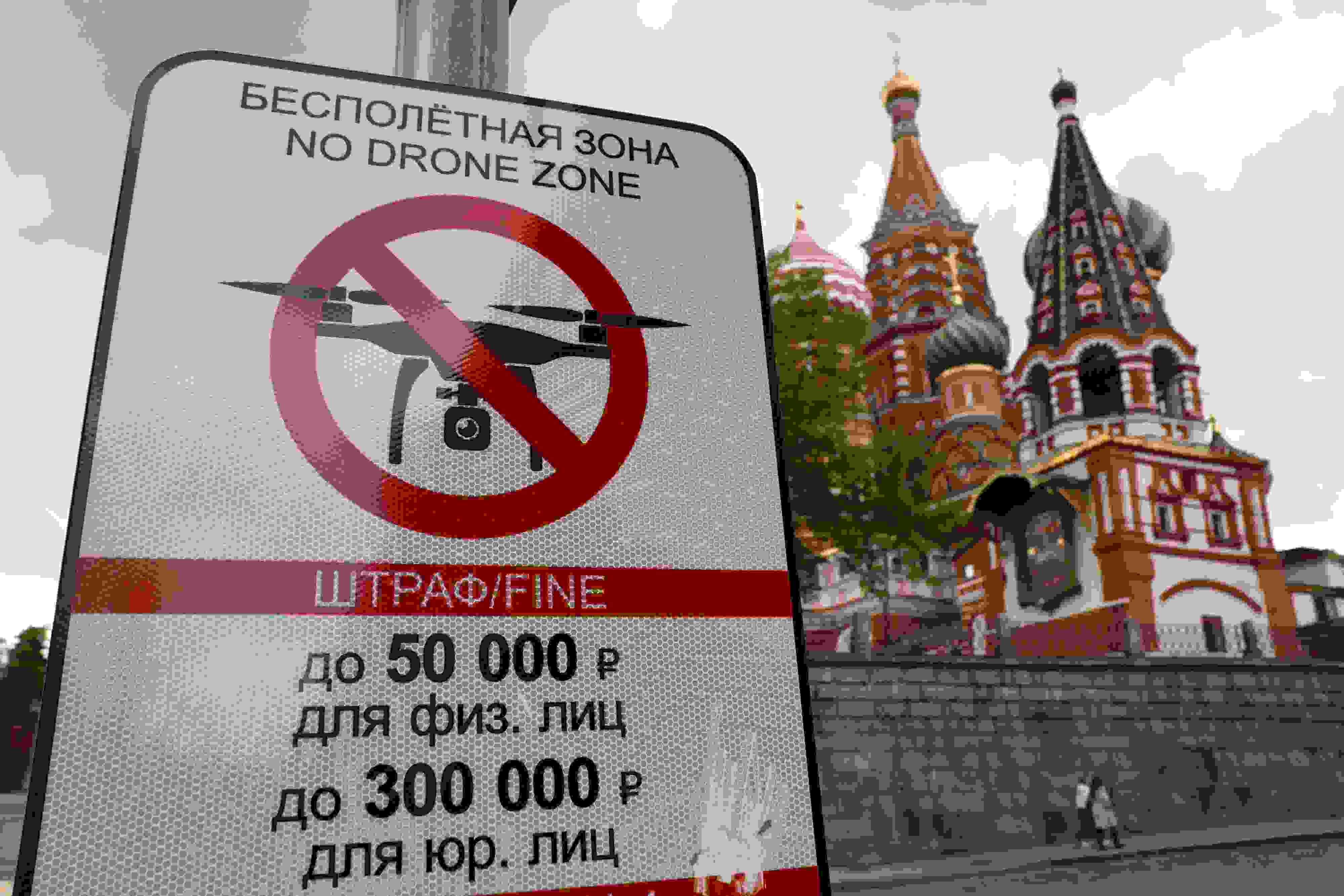 當(dāng)?shù)貢r間2023年5月3日,俄羅斯莫斯科,莫斯科市中心懸掛的“無人駕駛飛機(jī)禁飛區(qū)”的標(biāo)志,禁止無人機(jī)在該地區(qū)飛行??死锬妨謱m遭無人機(jī)襲擊后,莫斯科市長宣布禁止未經(jīng)授權(quán)的無人機(jī)在俄羅斯首都上空飛行。 視覺中國