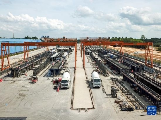 這是4月26日在馬來西亞吉蘭丹州拍攝的馬東鐵項目一分部制梁場(無人機(jī)拍攝)。新華社記者 朱煒 攝