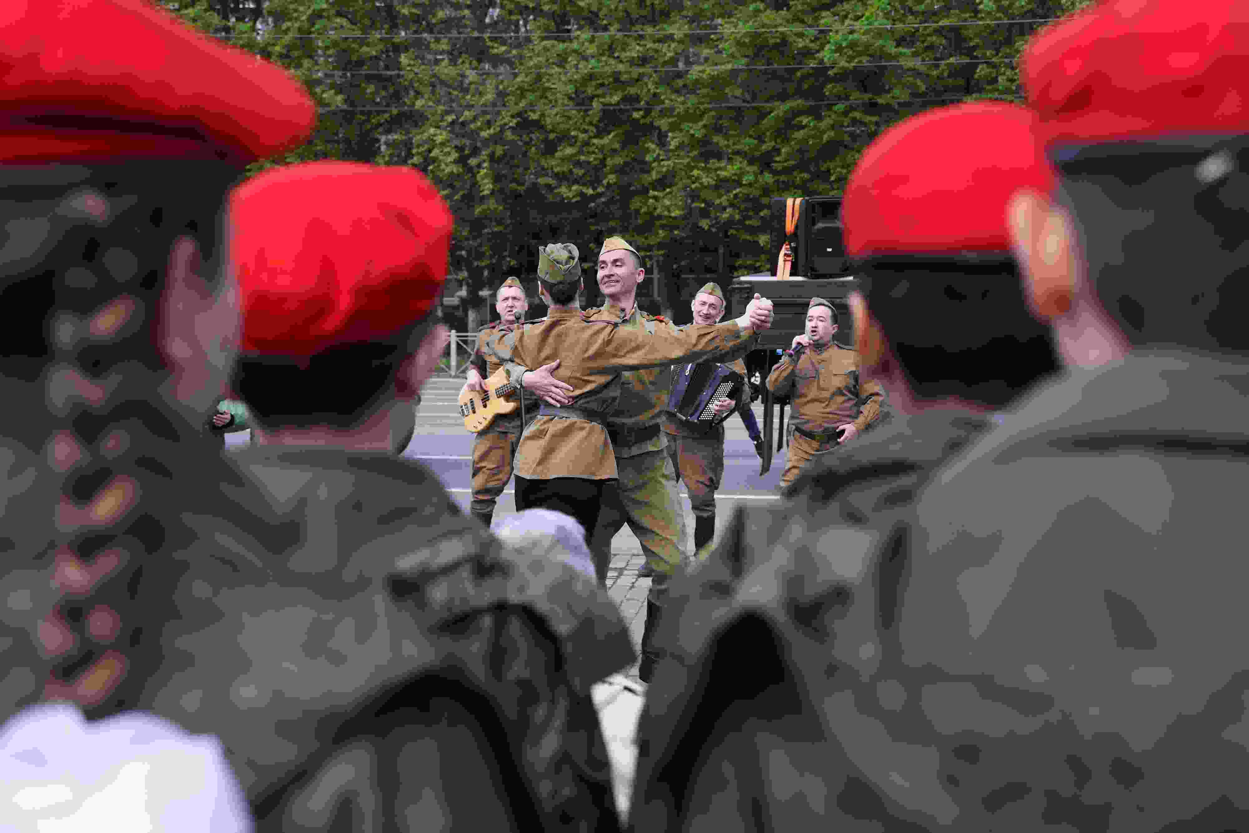 當(dāng)?shù)貢r間2023年5月8日,俄羅斯莫斯科,人們在紀(jì)念二戰(zhàn)勝利78周年的音樂會上表演。蘇聯(lián)解體后,俄羅斯自1995年起,在每年的5月9日舉行衛(wèi)國戰(zhàn)爭勝利日閱兵式及系列慶?;顒印?視覺中國