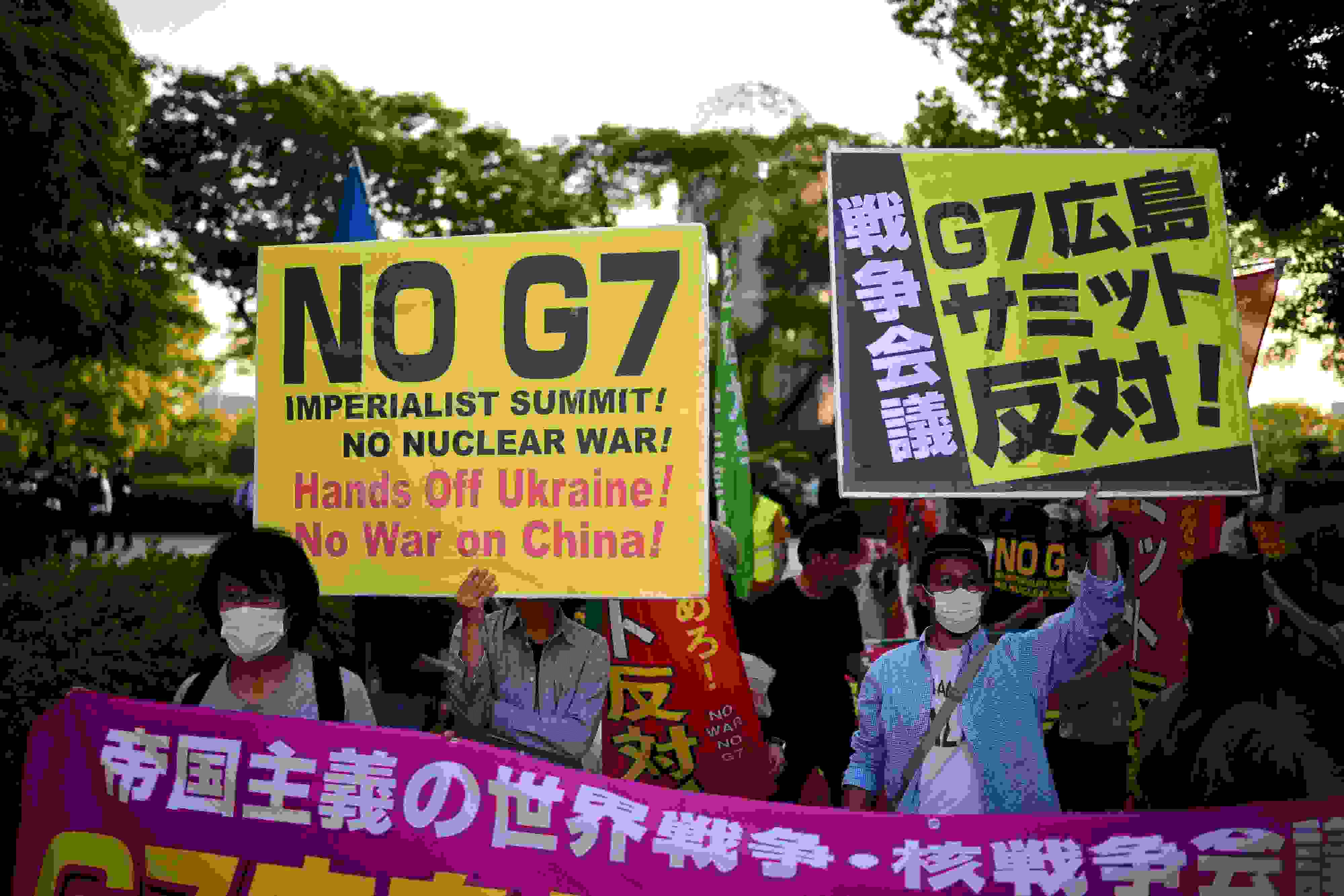 當?shù)貢r間2023年5月17日,日本廣島,日本民眾舉著各式標語,在廣島和平紀念公園原子彈轟炸遺址舉行集會,強烈抗議七國集團(G7)峰會將在廣島召開。 視覺中國