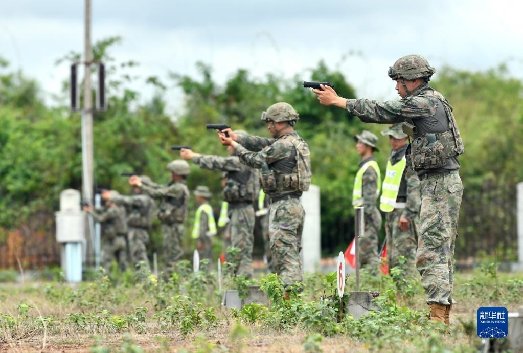 5月13日,在老撾人民軍庫(kù)瑪?shù)W(xué)院訓(xùn)練場(chǎng),中方參演官兵進(jìn)行手槍射擊示范。   新華社發(fā)(陽(yáng)吉成 攝)