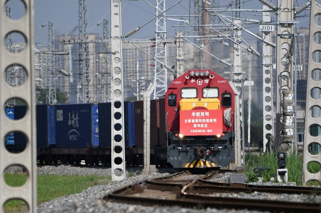 滿載土庫曼斯坦甘草中藥材原料的中歐班列回程列車抵達西安國際港站(2022年8月31日攝,無人機照片)。 新華社記者李一博攝