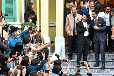 當(dāng)?shù)貢r(shí)間2023年5月17日,泰國(guó)曼谷,在一家餐館門口,泰國(guó)遠(yuǎn)進(jìn)黨黨魁和總理候選人皮塔等待與潛在的聯(lián)盟伙伴會(huì)面。