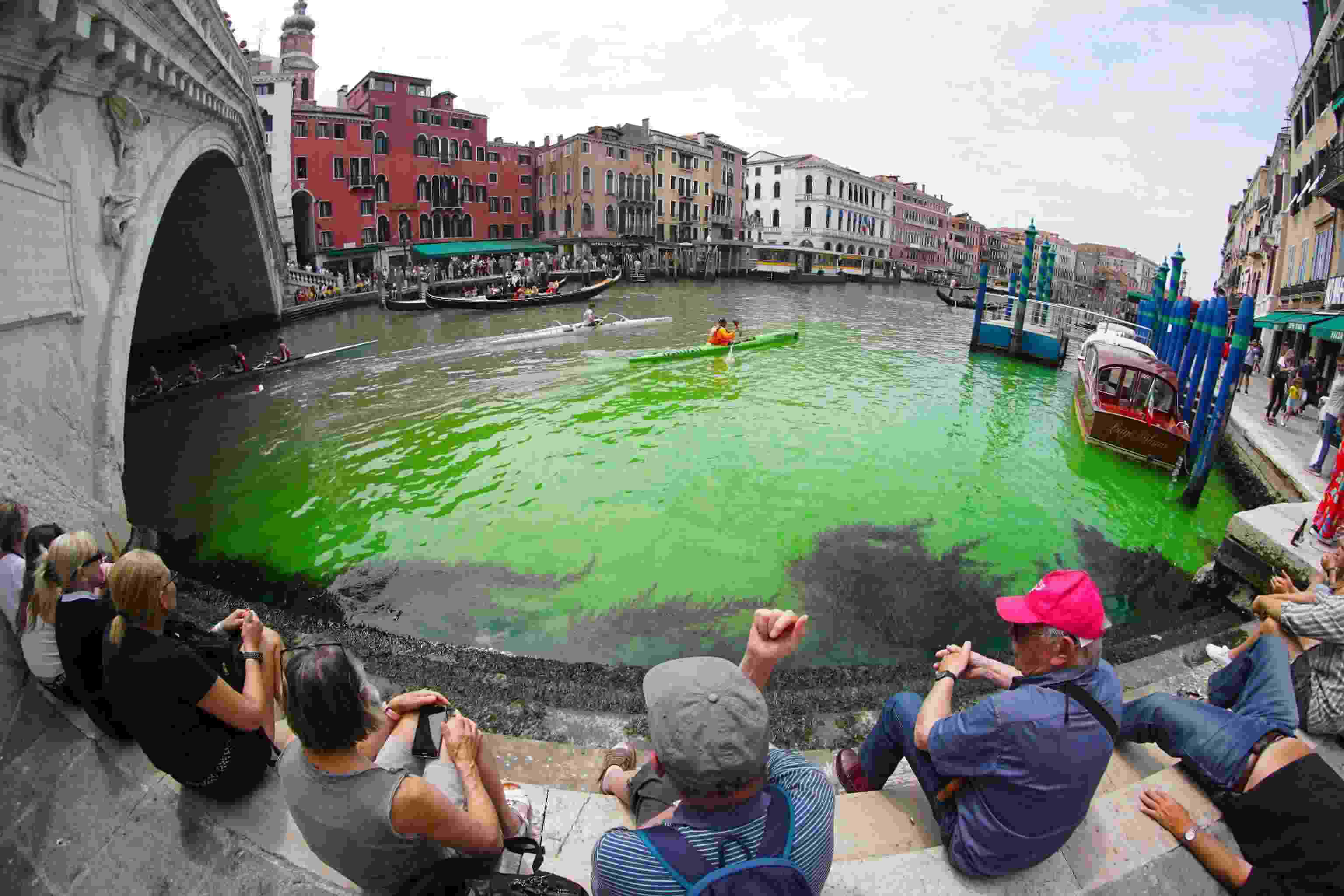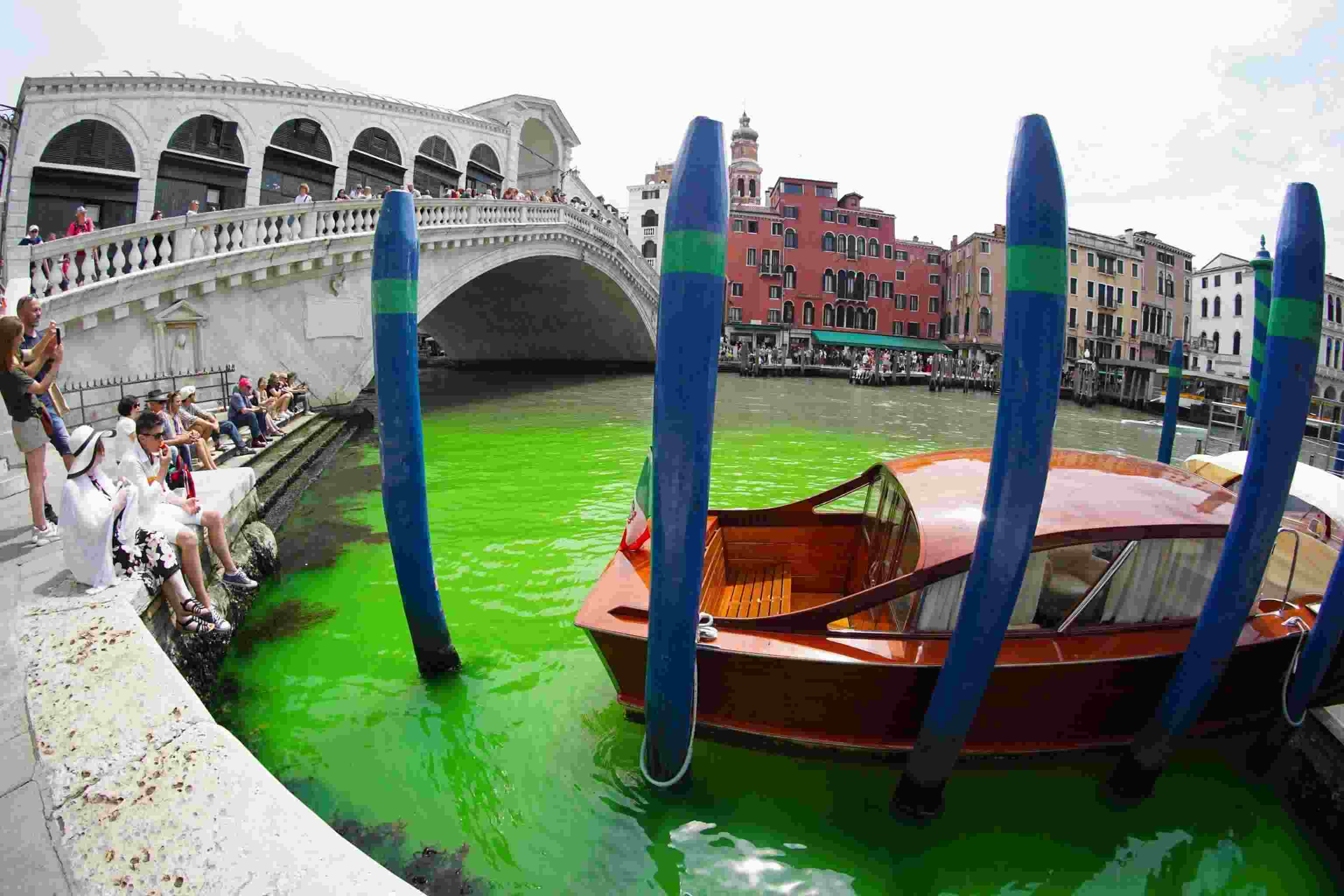 當?shù)貢r間2023年5月28日,意大利威尼斯大運河里亞托橋附近水域變成了熒光綠的顏色,警方等部門已經(jīng)介入調(diào)查,尋找原因。 視覺中國