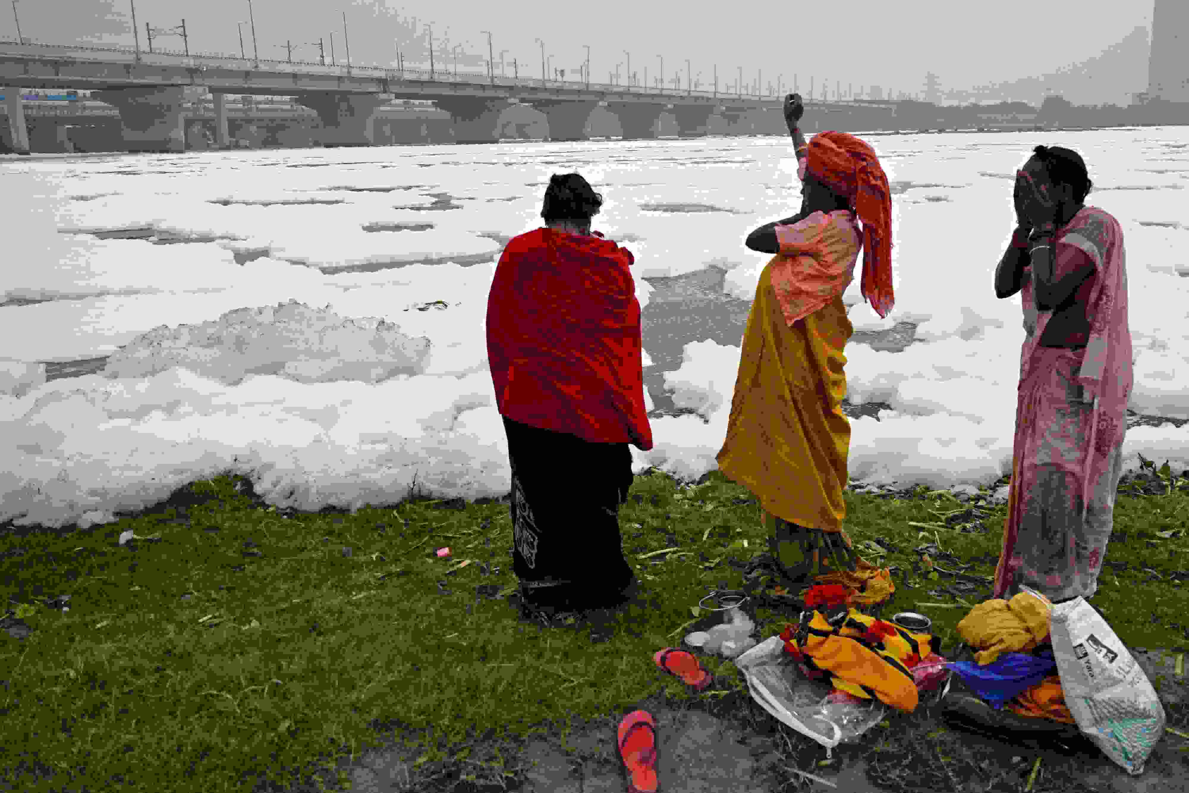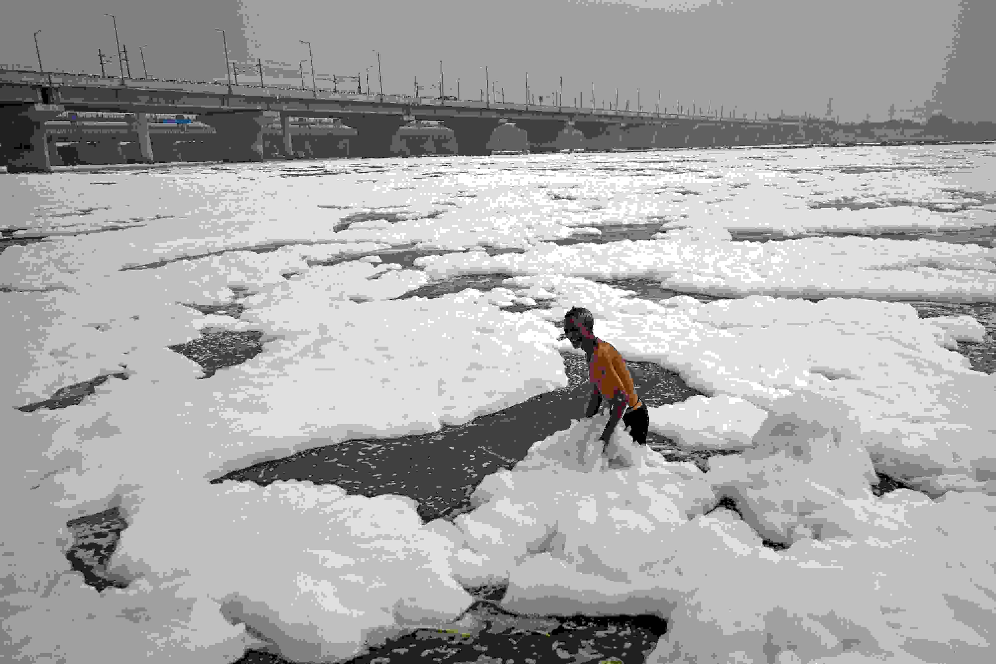 當(dāng)?shù)貢r間2023年6月4日,印度新德里,世界環(huán)境日前夕,人們在充滿有毒泡沫的亞穆納河中沐浴。 視覺中國