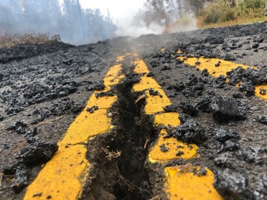 2018年5月9日,在美國夏威夷帕霍阿鎮(zhèn)附近的“莉拉妮地產(chǎn)”居民區(qū),火山活動造成地面出現(xiàn)裂縫。新華社記者陶希夷攝