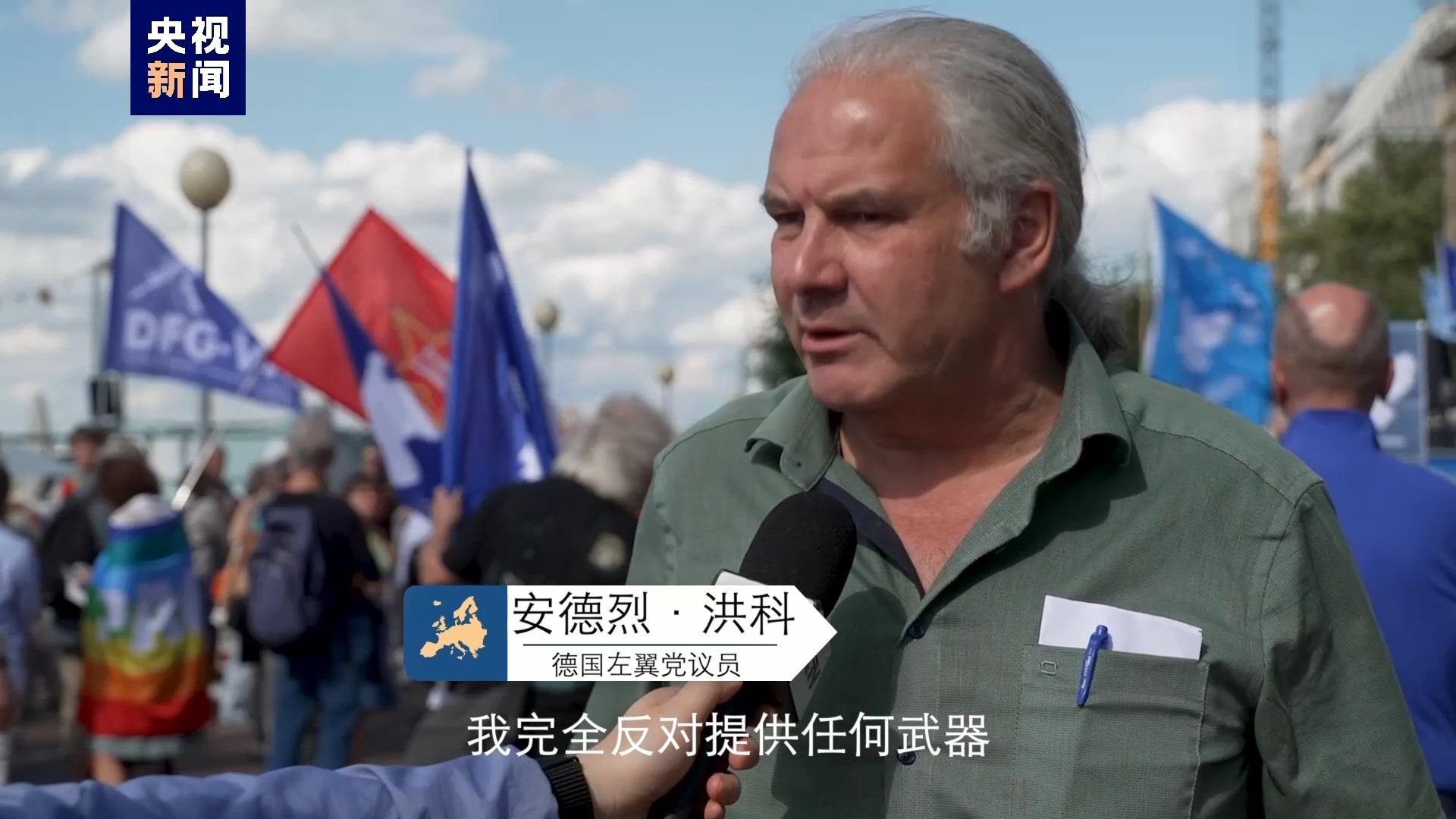 德國民眾 沃爾夫?qū)?/strong>:我們在這里(柏林)要求立即實現(xiàn)?;?。作為和平主義者我們反對北約,反對軍事手段。軍事手段不是俄烏沖突的解決方案。俄烏沖突只能通過外交手段解決。
