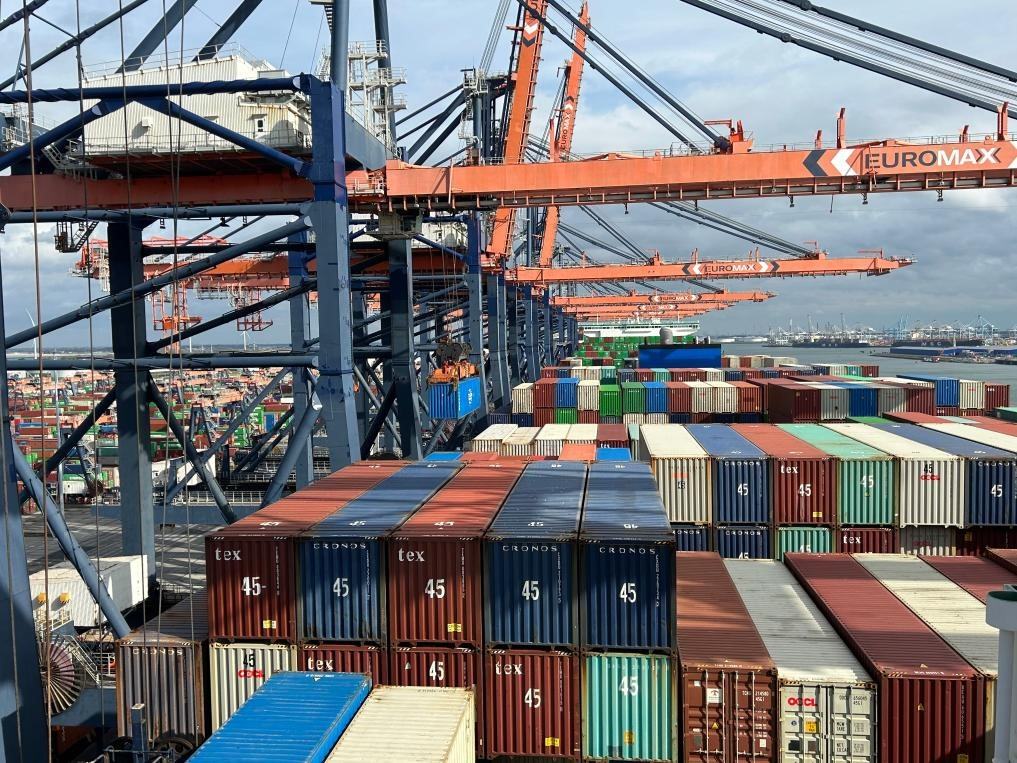 9月20日,“中遠海運室女座”號集裝箱船??吭诤商m鹿特丹港作業(yè)。新華社發(fā)