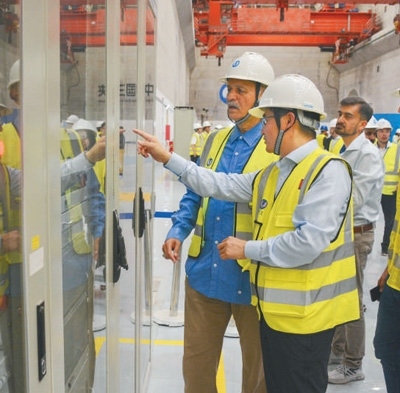 巴基斯坦卡洛特水電站是中巴經(jīng)濟(jì)走廊首個水電投資項目,由中國三峽集團(tuán)投資開發(fā)建設(shè),運營一年來節(jié)約標(biāo)準(zhǔn)煤約140萬噸,減少二氧化碳排放約350萬噸。圖為中方技術(shù)人員向來訪的巴基斯坦代表團(tuán)介紹水電站運行情況。本報巴基斯坦分社 薩義德·邁赫迪攝