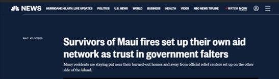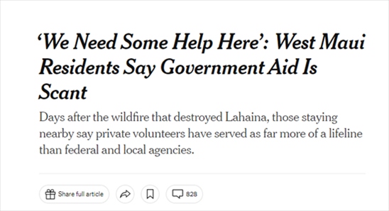 《紐約時報》8月13日發(fā)表報道稱,毛伊島野火造成2200多幢建筑倒塌,許多受災(zāi)居民缺少熱食、飲用水和庇護(hù)所。災(zāi)難發(fā)生后,當(dāng)?shù)刂驹刚呓M成了比聯(lián)邦和地方機構(gòu)更可靠的“生命線”。有居民表示,從聯(lián)邦和地方政府手中得到的救助遠(yuǎn)沒有從私人志愿者處得到的多。