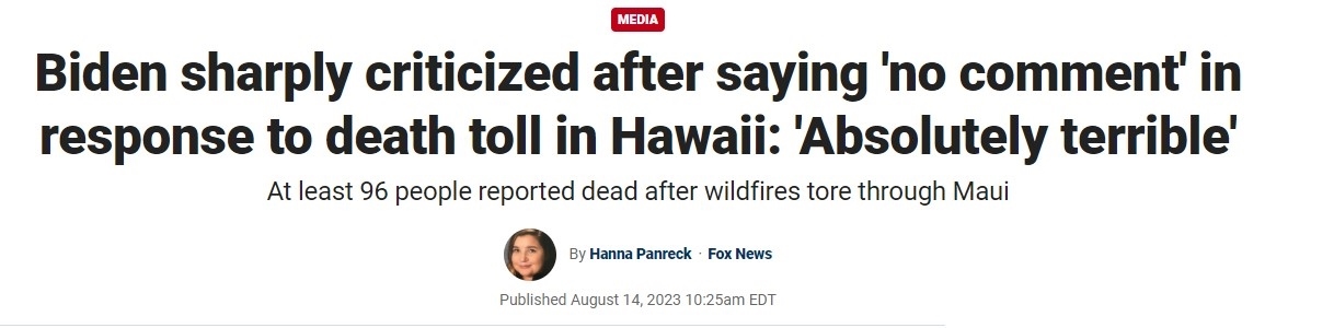 福克斯新聞網(wǎng)8月14日報道稱,當(dāng)?shù)貢r間13日上午,毛伊島救災(zāi)仍在進(jìn)行,美國總統(tǒng)拜登卻在其位于特拉華州里霍伯斯海灘的海邊別墅過周末。當(dāng)被問及毛伊島大火造成的死亡人數(shù)正不斷上升的問題時,拜登表示“不予置評”。