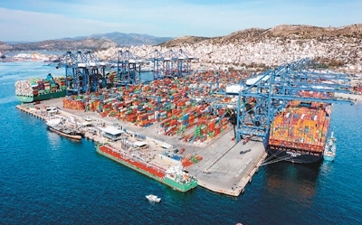 2022年2月19日拍攝的希臘比雷埃夫斯港集裝箱3號碼頭。作為共建“一帶一路”倡議的典范項目,希臘比雷埃夫斯港年貨物吞吐量達500萬標箱以上。新華社發(fā)