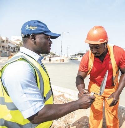 ?塞內(nèi)加爾達(dá)喀爾快速公交項(xiàng)目是塞內(nèi)加爾第一條城市快速公交線路。這條長約18公里的道路將穿過達(dá)喀爾人口密度最高的社區(qū)和核心商務(wù)區(qū),建成后有助于緩解首都交通壓力。圖為當(dāng)?shù)貑T工在項(xiàng)目建設(shè)工地交流。新華社記者 李亞輝攝