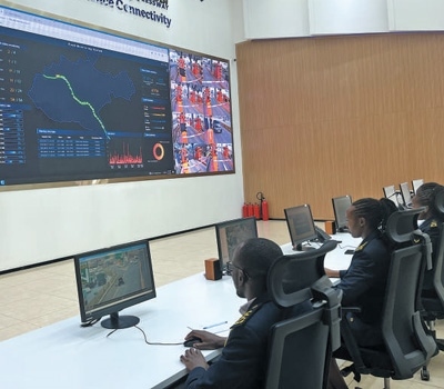 在肯尼亞內(nèi)羅畢快速路監(jiān)控中心,工作人員正在監(jiān)測車輛運(yùn)行狀況。鄭文嬌攝