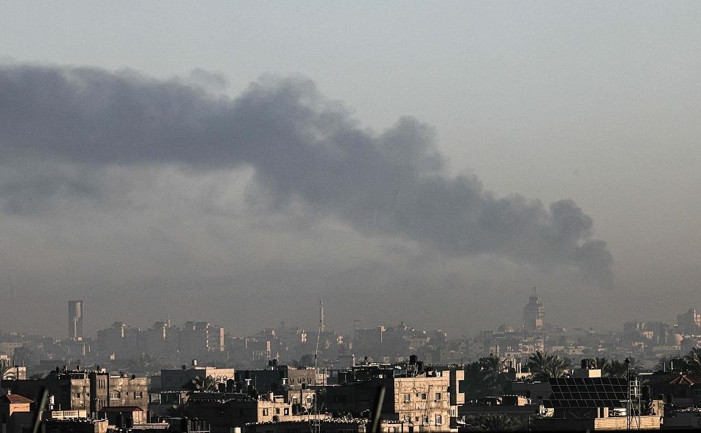 △當(dāng)?shù)貢r間12月15日,以色列空襲過后,加沙地帶南部城市汗尤尼斯上空濃煙滾滾。