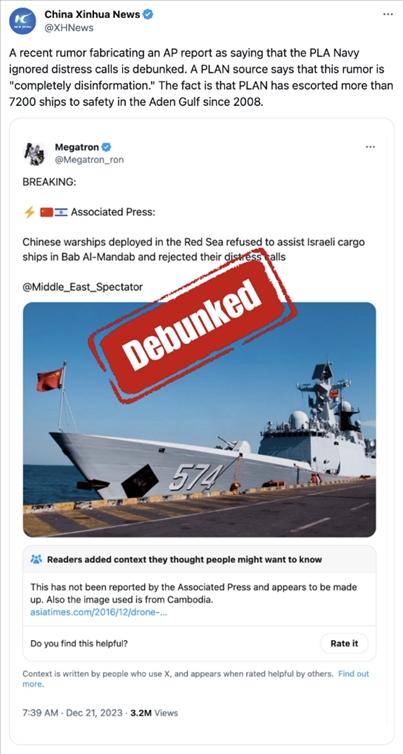 一個(gè)名為“Megatron”的擁有十多萬“粉絲”的賬號(hào)在社交平臺(tái)“X”(原推特)上說:“美聯(lián)社突發(fā)新聞!中國(guó)軍艦在曼德海峽拒絕協(xié)助以色列貨船,且無視他們的呼救?!辟N文后還配了一張中國(guó)軍艦的照片。