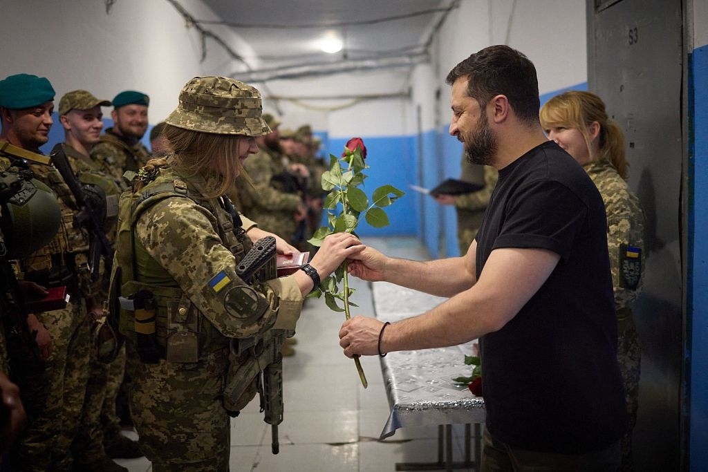 當?shù)貢r間2023年9月4日,頓涅茨克地區(qū),烏克蘭總統(tǒng)弗拉基米爾·澤連斯基(右)在視察前線指揮所,并送女兵玫瑰花。