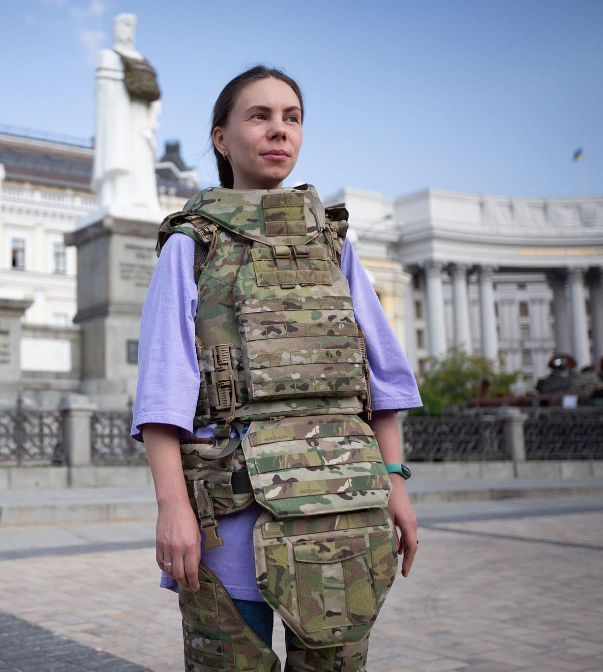 當?shù)貢r間2023年9月14日,烏克蘭基輔,一名婦女在基輔展示為女兵特別設計的防彈衣。
