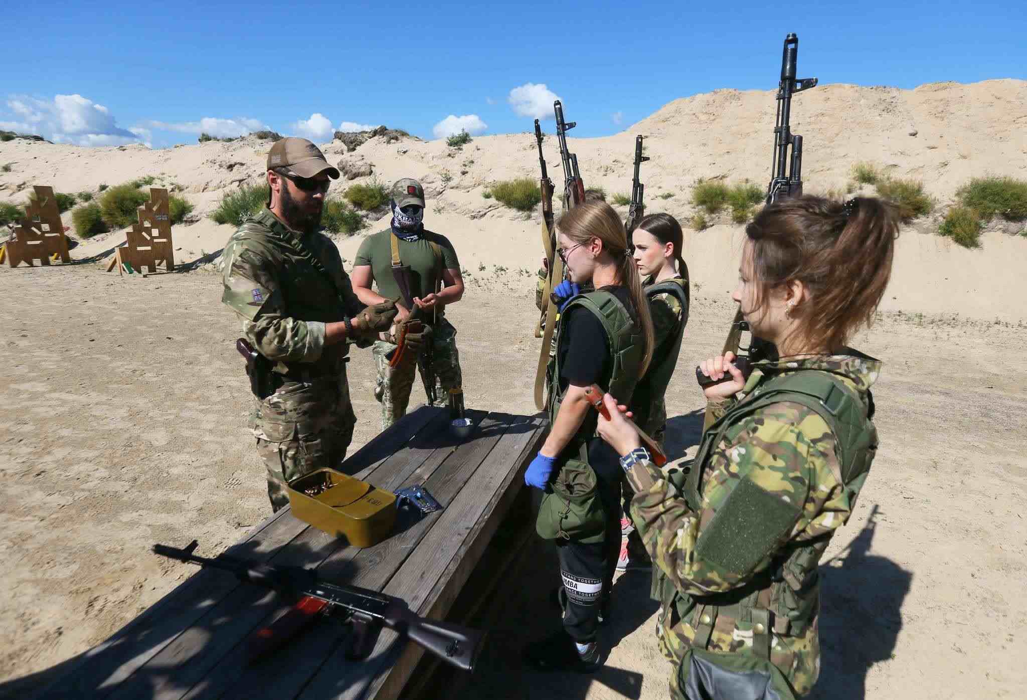 當?shù)貢r間2023年7月12日,烏克蘭基輔,烏克蘭女兵學習使用槍械。