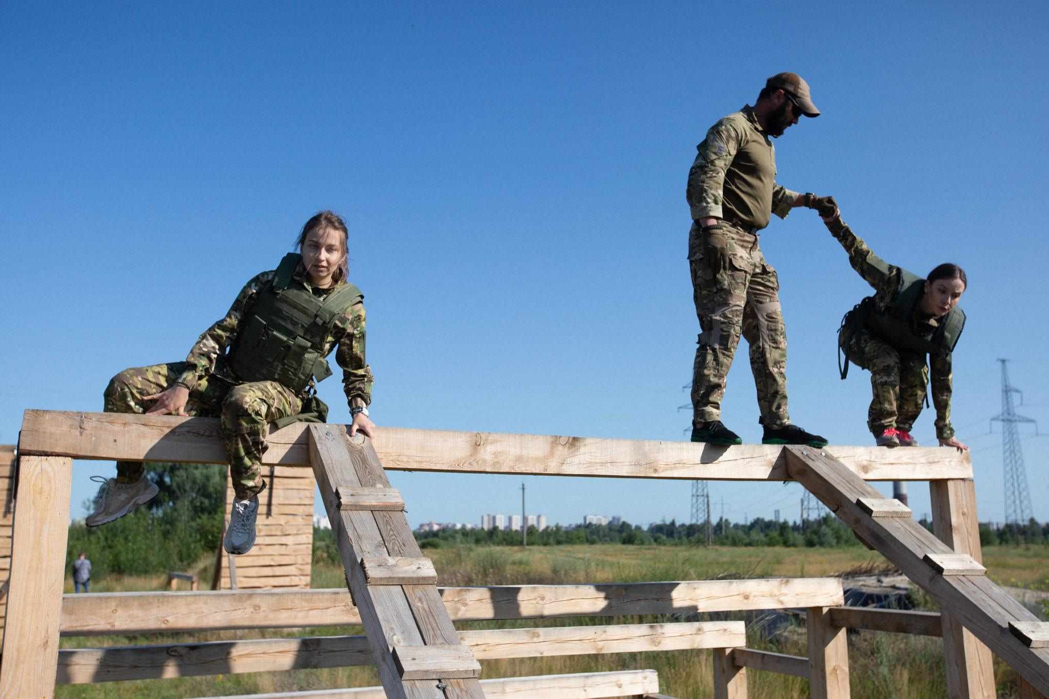 當?shù)貢r間2023年7月12日,烏克蘭基輔,烏克蘭女兵身穿新款野戰(zhàn)服參加軍事訓練。