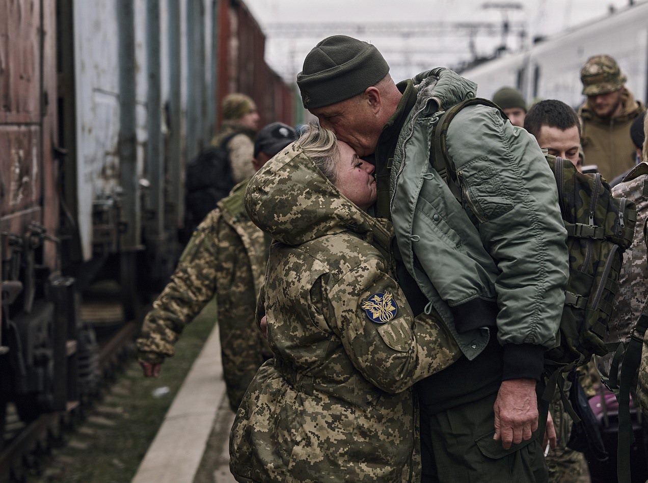 當?shù)貢r間2023年3月29日,頓涅茨克地區(qū)克拉馬托爾斯克,一名即將去前線的烏克蘭女兵在火車站與丈夫分別。