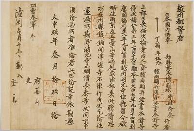 853年,圓珍入唐,先后在福州開元寺、天臺(tái)山國(guó)清寺、長(zhǎng)安青龍寺等地修學(xué)。858年,圓珍攜大量經(jīng)卷、法器等回到日本,被尊為三井寺第一代住持,并成為日本天臺(tái)宗寺門派創(chuàng)始人。在唐求法期間,圓珍與各界人士結(jié)下深厚友誼。圓珍的親身經(jīng)歷以及他和唐朝人士的往來信件等,成為中日文化交流的歷史見證。