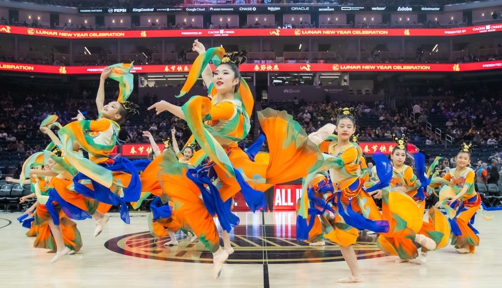 2月14日,舊金山華人藝術(shù)團演員在比賽中場為觀眾表演,歡慶中國農(nóng)歷新年。新華社發(fā)(董旭東攝)