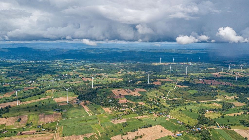 這是2023年10月5日在泰國(guó)猜也蓬府拍攝的由中國(guó)金風(fēng)科技提供的風(fēng)力發(fā)電機(jī)(無(wú)人機(jī)照片)。新華社記者王騰攝