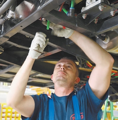 位于匈牙利科馬羅姆的比亞迪電動(dòng)大巴工廠內(nèi),工人正在作業(yè)。本報(bào)記者 顏 歡攝