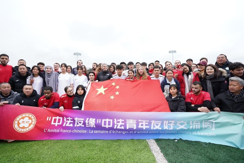 在比賽的休息時(shí)間,球隊(duì)雙方進(jìn)行了文化表演交流?!按宄甭?lián)隊(duì)帶來了苗族、侗族歌舞,贏得法國青年代表隊(duì)的熱烈歡呼。法國青年代表隊(duì)則以《玫瑰人生》《香榭麗舍大街》兩首法國歌曲予以呼應(yīng),收獲現(xiàn)場觀眾的陣陣掌聲。