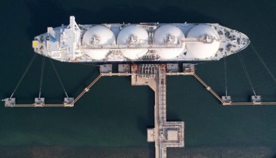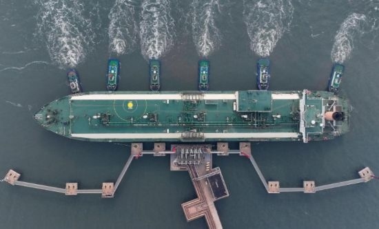 2023年11月15日,來自卡塔爾的“阿爾達(dá)夫那”號(hào)LNG輪在拖輪的協(xié)助下向唐山港曹妃甸港區(qū)中國石油唐山LNG接收站碼頭靠泊(無人機(jī)照片)。新華社記者楊世堯攝