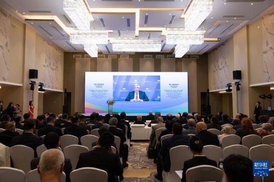 9月23日,在俄羅斯首都莫斯科,俄羅斯國家杜馬第一副主席、俄中友好協(xié)會主席伊萬·梅利尼科夫在論壇上發(fā)表視頻講話。新華社記者 白雪騏 攝