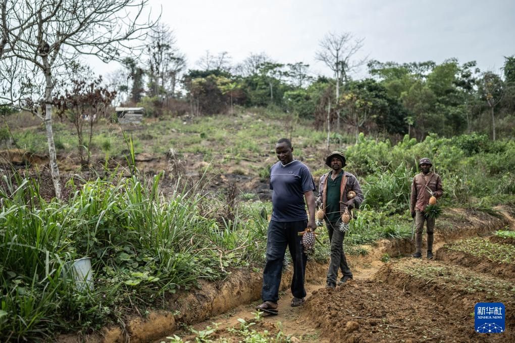 8月1日,農(nóng)民阿蘭(左)在剛果(布)國(guó)家一號(hào)公路沿線的菠蘿地內(nèi)采摘菠蘿。